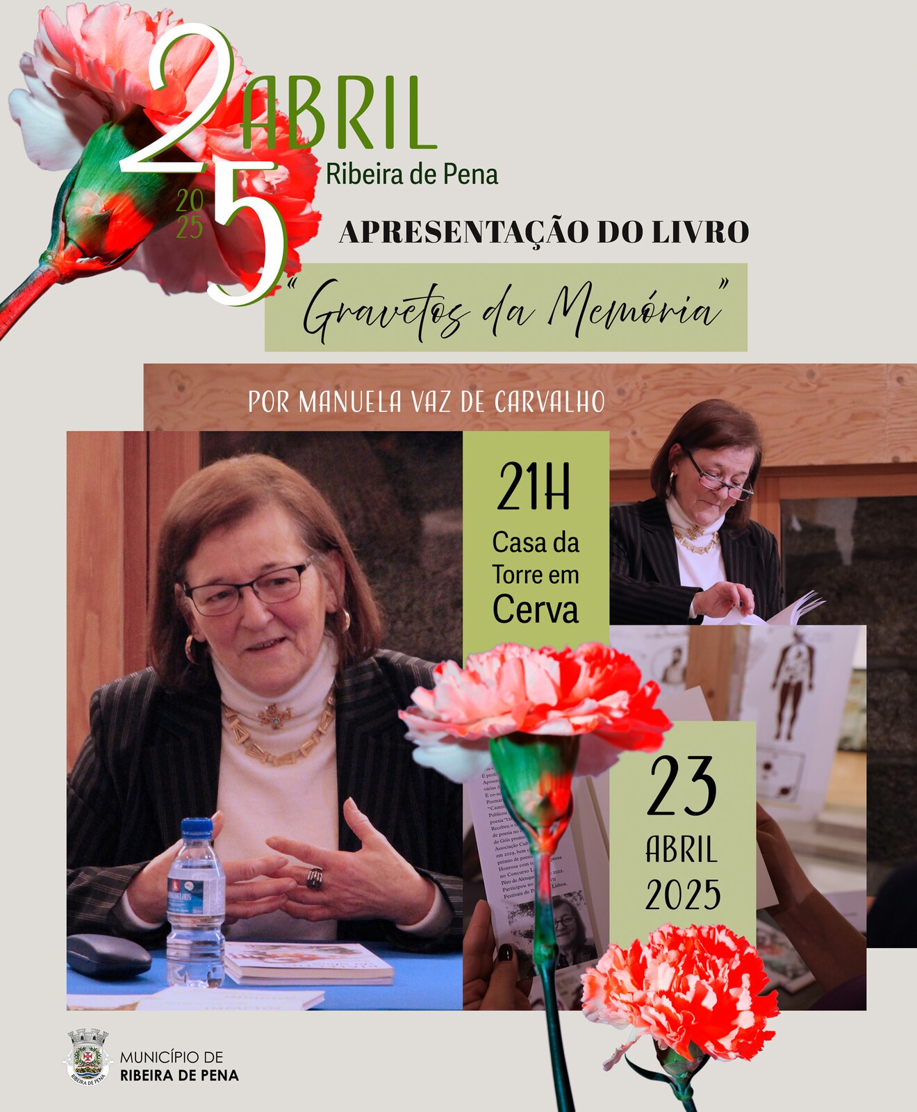No dia 23 de abril de 2025, às 21h00, na Casa da Torre em Cerva, será apresentado o livro “Gravetos da Memória” por Manuela Vaz de Carvalho. Esta iniciativa, promovida pelo Município de Ribeira de Pena, insere-se nas comemorações do 25 de abril e a sua participação é gratuita.