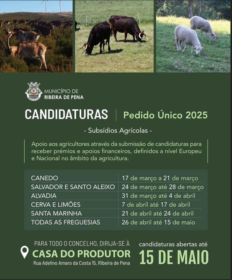 O prazo para submissão das candidaturas termina a 15 de maio. Para garantir o acesso a estes subsídios, dirija-se à Casa do Produtor, localizada na Rua Adelino Amaro da Costa, 15, Ribeira de Pena.